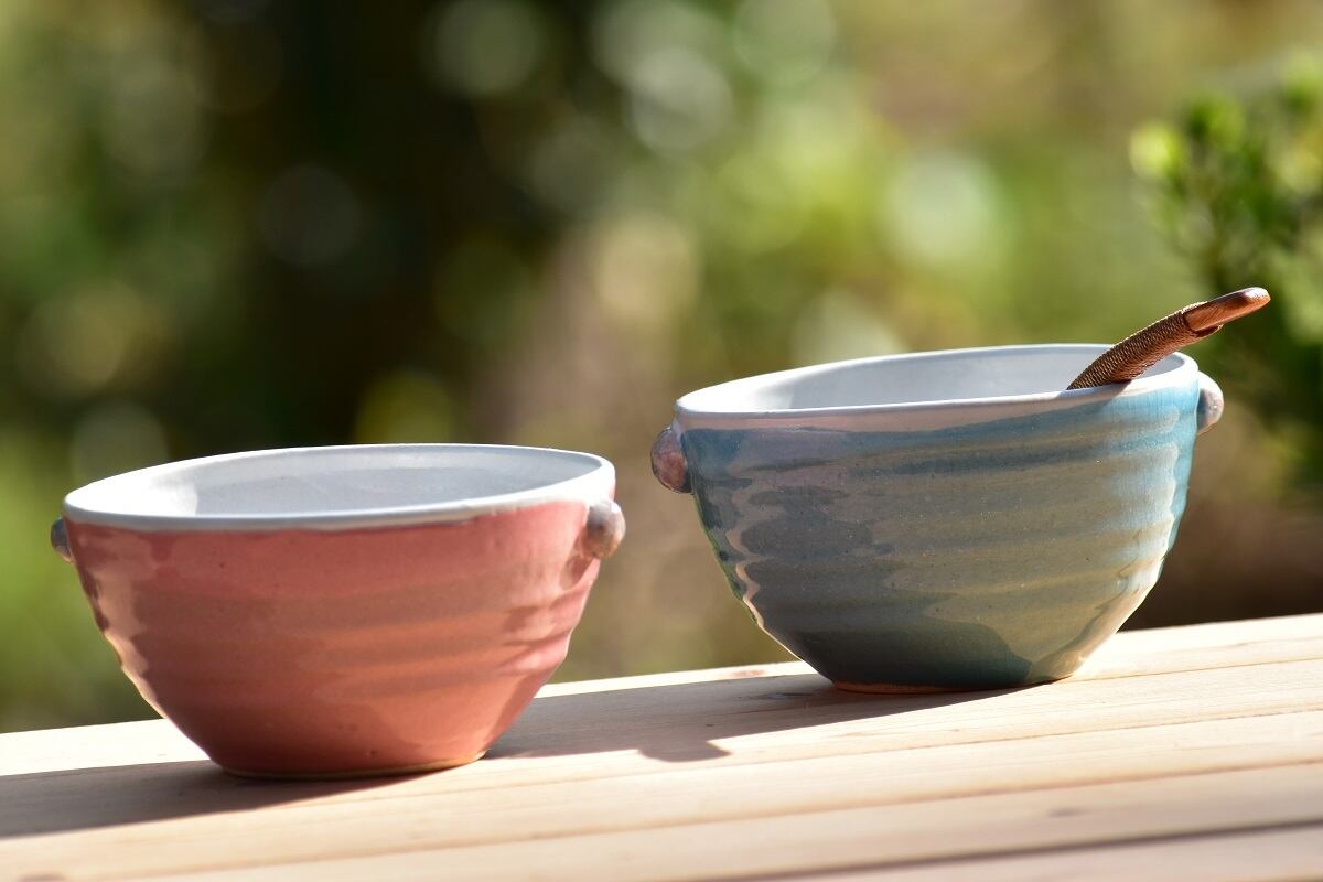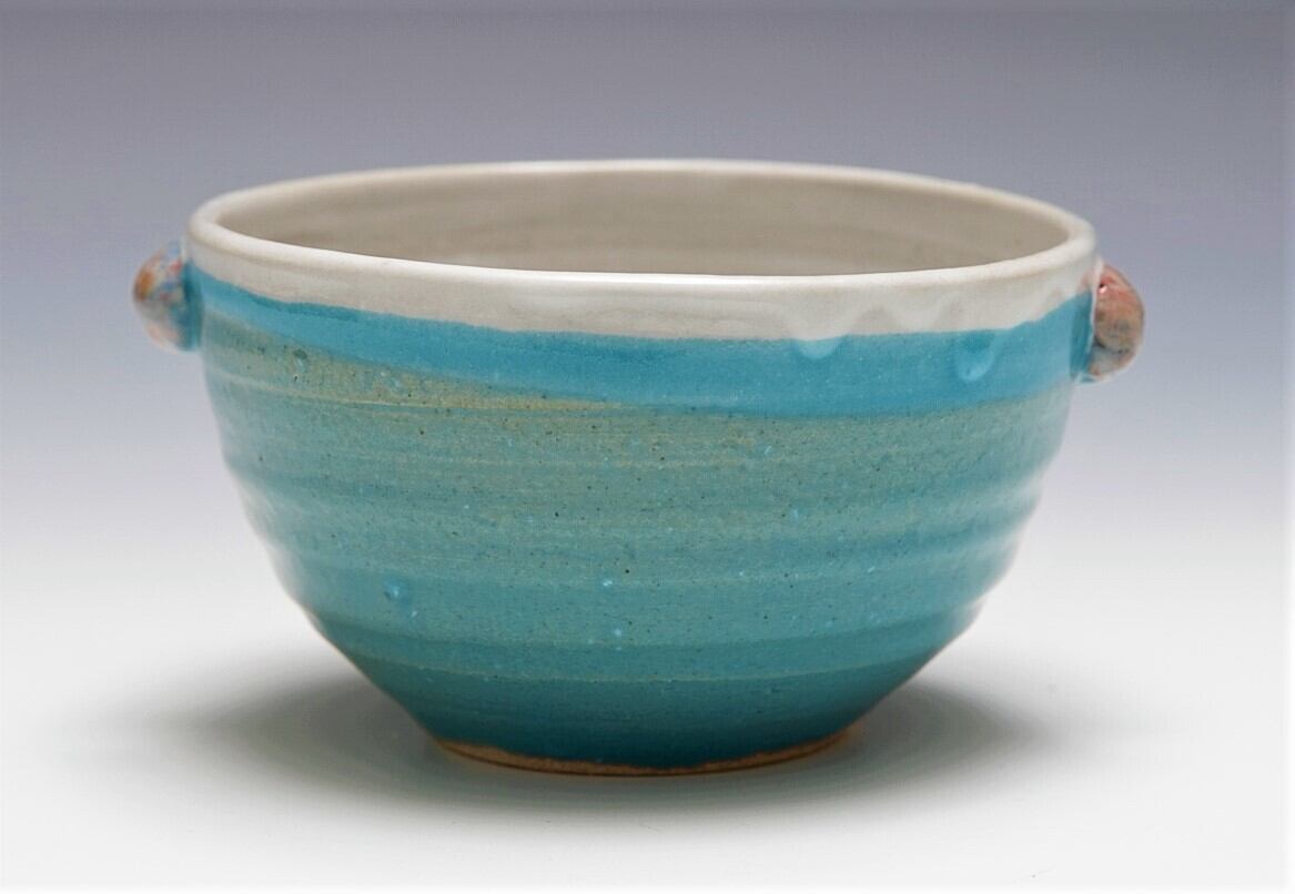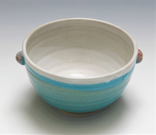 内側に藁白釉、外側はpink色の釉で掛け分けてます。両サイドにmarble模様のポチが付いています。小さな子供さんの食器にもどうぞ。