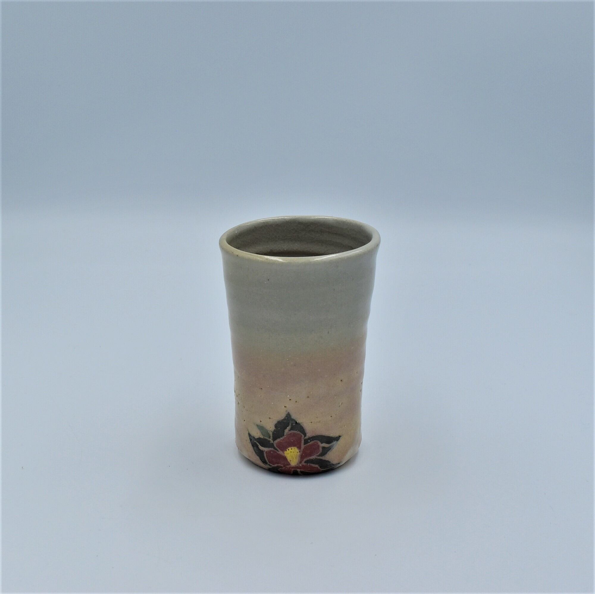 いわゆる萩焼らしく仕上げワンポイントに椿を描いています。お湯呑として使えますし、一口ビアにも良いです。色違いのフリーカップ椿文小とペアがオススメです。