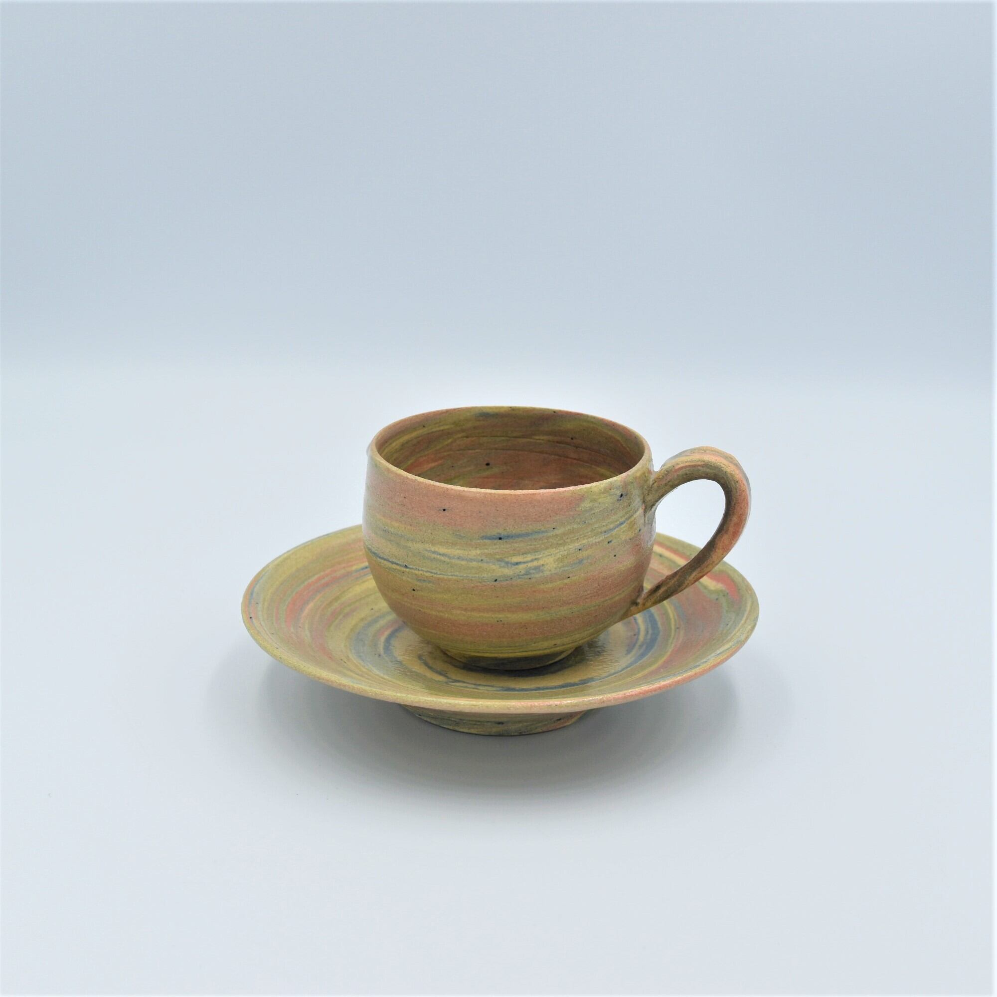 5色の色粘土を練り込みマーブル模様に仕上げました。どの角度からも楽しめる色合いになってます。皿も小皿として使えます。マーブル模様は毎回窯出し時で変わってきます。